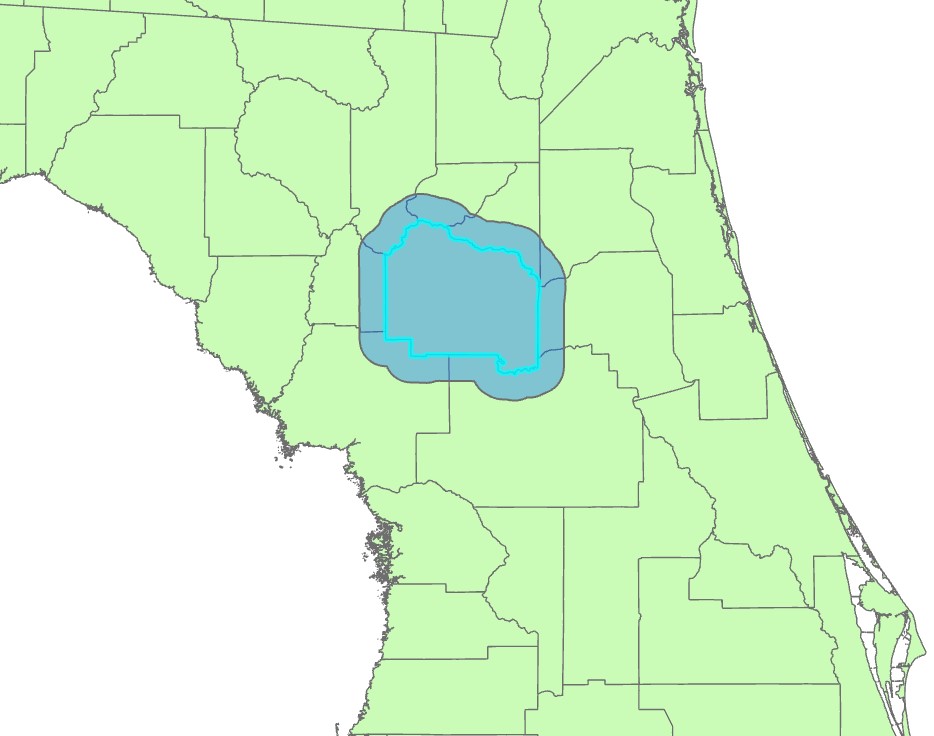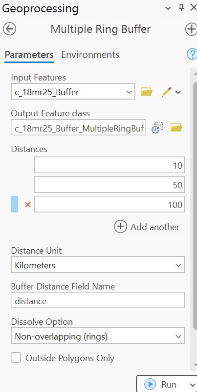 A similar tool, the Multiple Ring Buffer tool will create multiple buffers based on a set of distance values defined by the user. These rings can have an equal interval or any values as needed for the particular application. The ring buffers can be non-overlapping (rings) or they can by overlapping (each subsequent buffer will include the previous one). The following creates multiple ring buffers around Alachua county at distances of 10 km, 50 km, and 100 km.