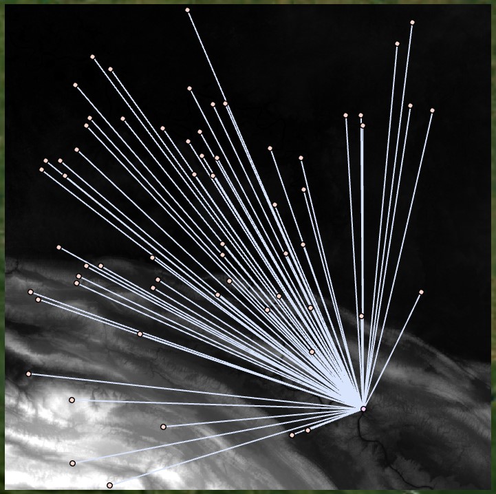 The resulting surface shows a dendritic network of paths. We can create more of a spider web network, which more accurately represents the shortest Euclidean distances from each point to the destination; for example, we can input our distance raster into the Least Cost Path tool. We input the Euclidean distance raster as the input cost surface, and we define the starting and ending points. For best results, use a single start point with travel to ending points that can represent one or many places: