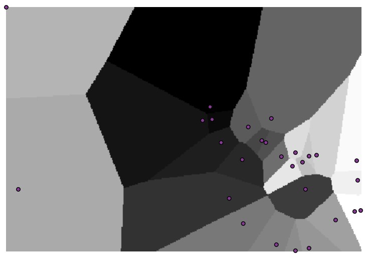 The Distance Allocation tool assigns each raster area of interest or feature class to its own zone, based on proximity to other raster areas of interest or feature classes. The resulting raster surface shows these zones with their boundaries marking the midpoint between these raster areas of interest or feature classes. Each pixel is assigned a unique value that matches the value of the nearest input cell or feature class of interest.