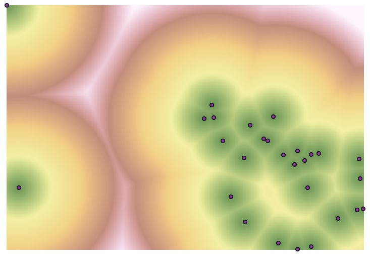The following grid is an example of straight line distance accumulation between a set of input points. Each cell represents the distance to the nearest input cell or feature class of interest.