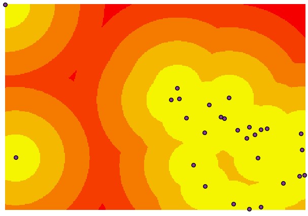 Note that a similar visualization to that achieved with the Buffer or Multiple Ring Buffer tool can be achieved by changing the symbology of the distance accumulation raster, namely by changing the Stretch symbology to Classify.