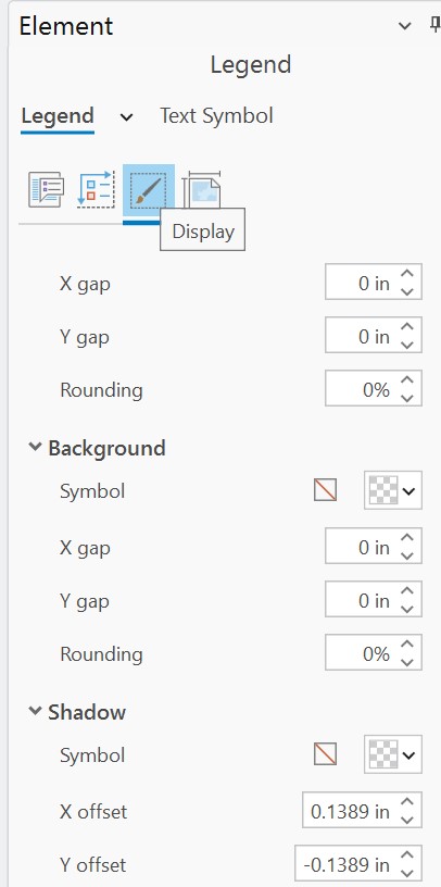 Additional properties can be edited, including the map frame, the legend, scale bar, etc. by selecting the option, right-clicking Properties, then clicking on the Display icon. Here, you can add borders, backgrounds, shadows, etc. to your layout objects.