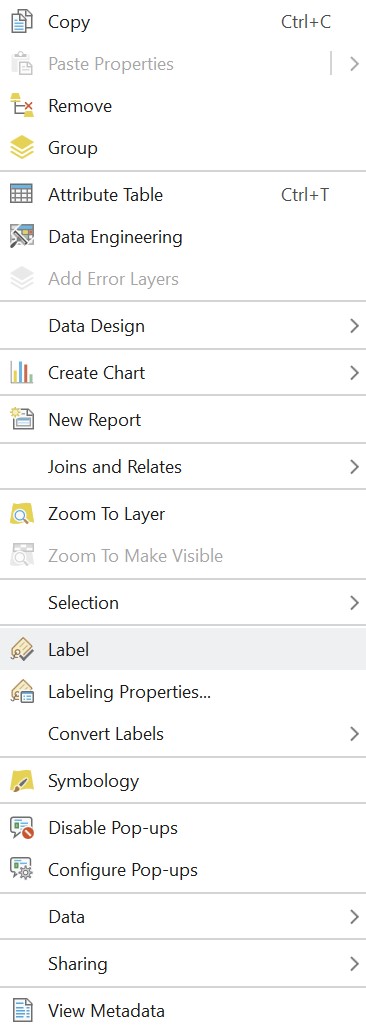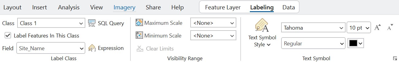 To edit the style of the labels, click the Labeling tab while the layer is selected in Contents. Under Label Class -> Field, select where the labels are stored in the attribute table, and under Text Symbol, edit the size and style of the labels. Under Label Placement, define how labels will be placed and visualized, which can be challenging with dense data with multiple overlapping labels.
