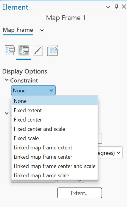 Alternatively, you can more accurately set the scale of your map frame by editing its properties. To the right of Navigate, click the Select button, then click on your map frame on your page layout. Right-click and select Properties. The Element pane should appear, where you can open Display Options. At the bottom, you will see Scale, where you can choose more typical values for map scales, including 1:10,000 or 1:50,000, for example.