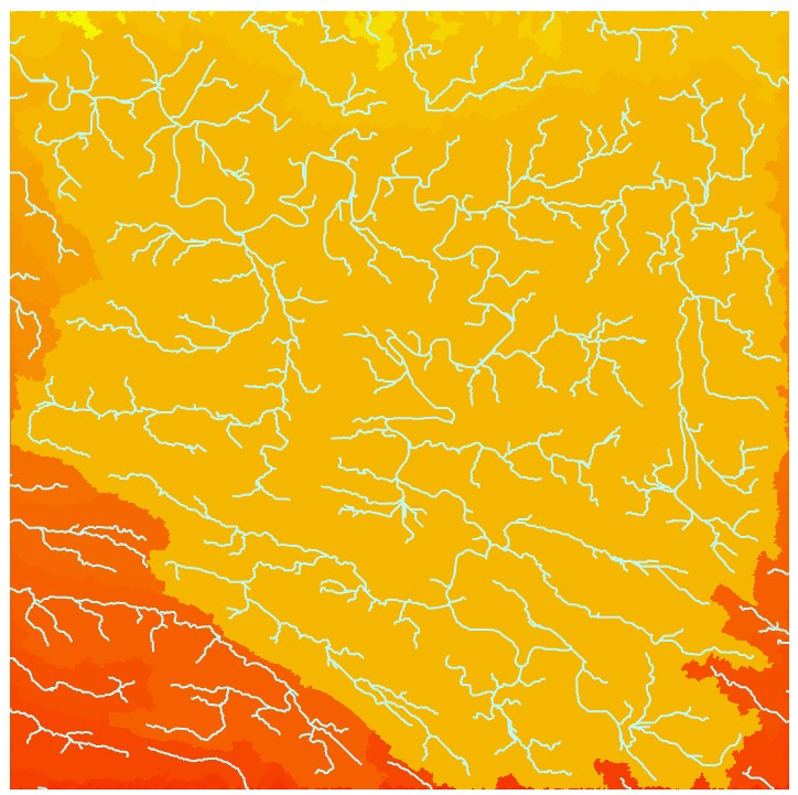 In this operation, the flow accumulation raster values below 3500 are set to NoData, otherwise values above 3500 keep the same values in the flow accumulation raster. The resulting raster surface shows streams classified based on stream order: