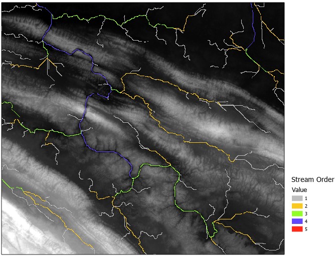 The Stream Order tool will take a raster input of a stream network and generate a new raster showing stream order. Stream order refers to a hierarchical network of streams, with higher order streams representing major waterways and first-order streams representing the smallest tributaries.
