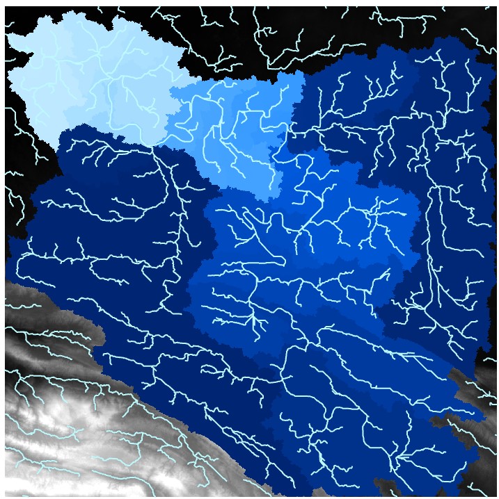 The Basin tool creates a raster delineating drainage basins. The basins are defined by the presence of ridge lines. The input is a D8 flow direction raster.