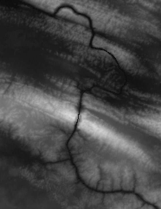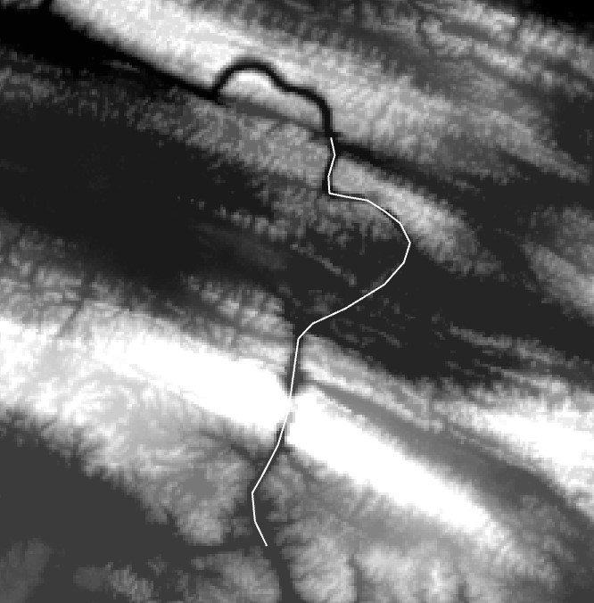 Here, the high order stream (major river) enters a narrow canyon. During the interpolation of the SRTM DEM to fill voids, high elevation values for the canyon walls replaced the actual elevation values at the river surface.