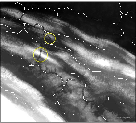 In the following zoomed in portion of the stream network, we can see that two areas caused issues inside the yellow circles: