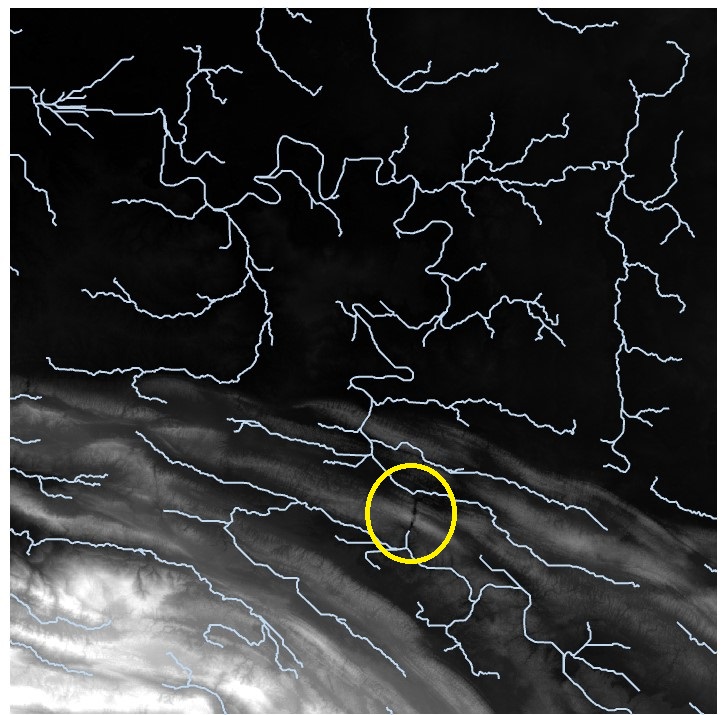 In the previous flow accumulation analysis, for example, we can see a major error in the stream network, inside the yellow circle: