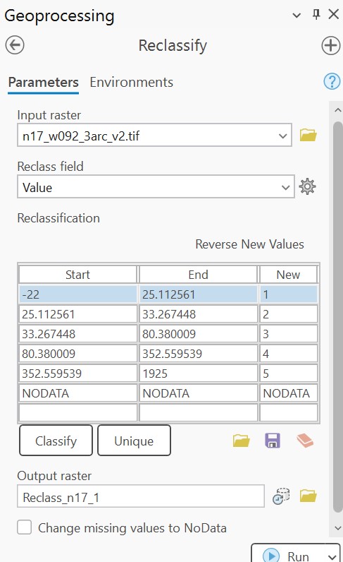 According to this table, all values in the range from Start to End will be reclassified to the value under the New column. NODATA will remain unchanged. The output raster will look similar to the classified output, but now the range of cell values is only 1 to 5, rather than -22 to 1925.