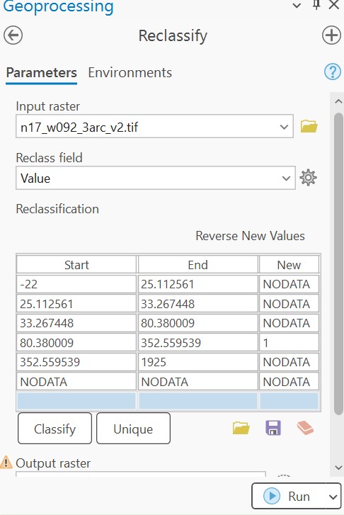 When loaded into the Reclassify tool with a single range of values, the reclassification table is populated as the following: