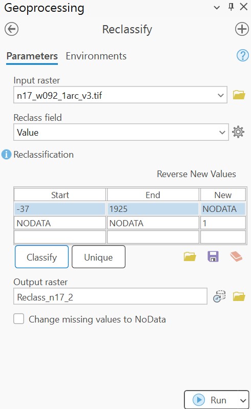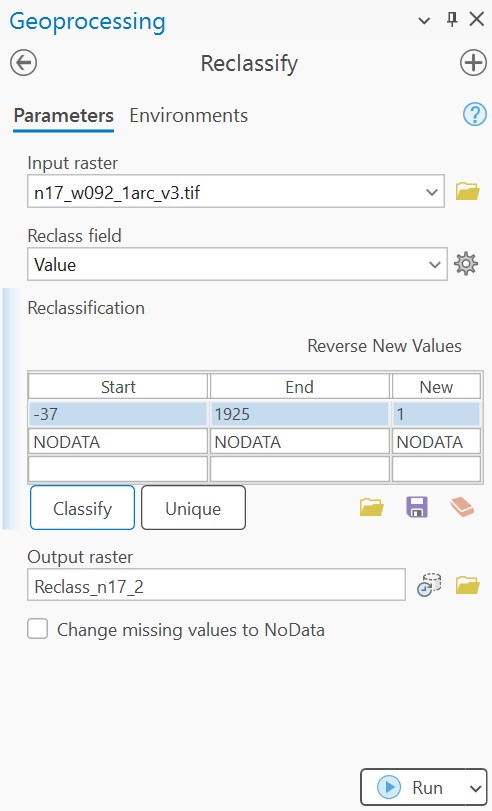 The Reclassify tool is most useful when establishing inputs of equal weights when developing models. For example, different input variables (e.g., elevation, soil type, precipitation) can be scaled between 1 to 10 to assist with comparison.