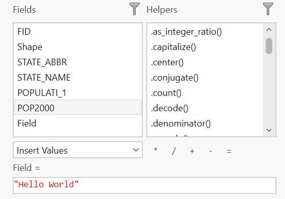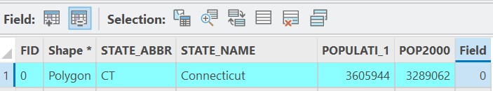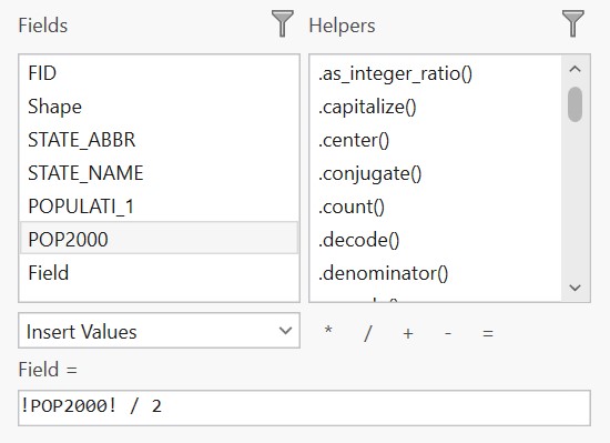 First, select a record, click Calculate Field, and in the new window enter an operation under Field = . For example, the following operation will populate the “Field” column with values that are equal to half of the POP2000 column.