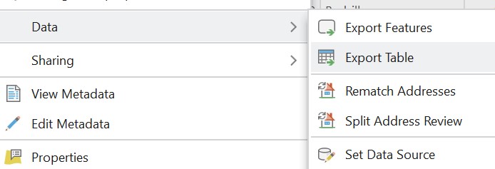 The attribute table can then be exported by right-clicking on the layer under Contents, selecting Data -> Export Table. Select an output location and file type, and click OK.