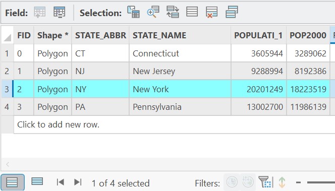 You can select a specific record or row by clicking the number of the row at the far left of the table. In the following table, row 3 (New York) has been selected. Note at the bottom of the table the caption that states 1 of 4 selected.
