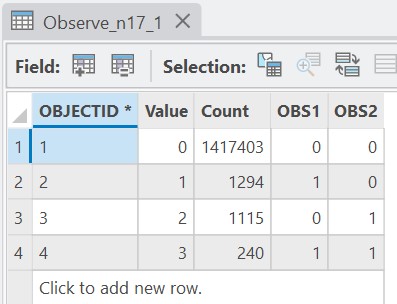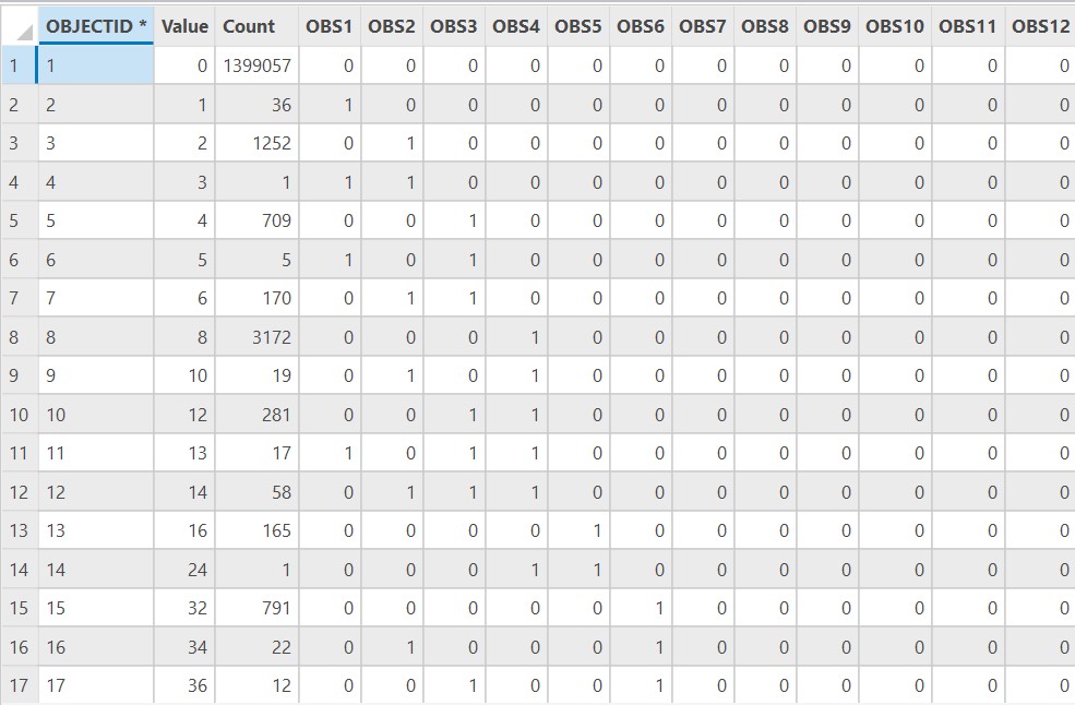 A maximum of 16 observer points can be input into the Observer Points tool; however, the tool is best used with fewer points, as the output can get too burdensome. Take a look at the output raster’s attribute table, for example, when 12 points are input. These data could be difficult to decipher and visualize properly: