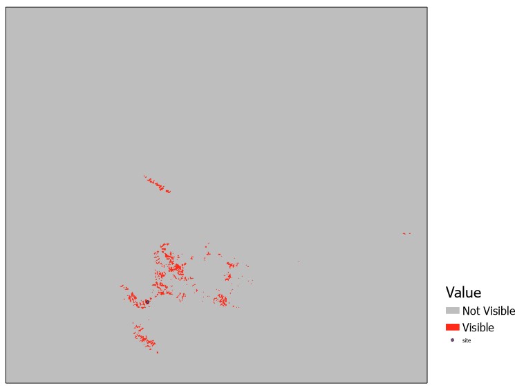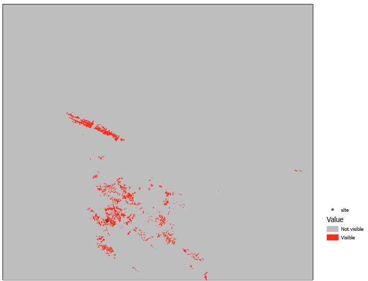 If we instead add the value 10 to the OFFSETB column, we are adding that offset to all cells other than the observer point. We are therefore elevating the surrounding terrain while keeping the observer point the same. The resulting output raster will show areas where a 10 m high feature would be visible from the observer point: